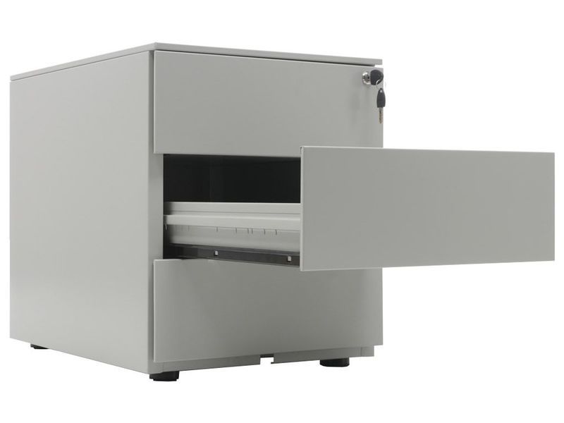 - Опции: пластиковые лотки и металлический ящик для канцелярских принадлежностей и других предметов. Возможность комбинирования цветов: корпус + фасады ящиков и крышка (конструкция тумбы металл+металл). Или отделка фасадов ящиков и крыши тумбы ламинированной плитой ЛДСП