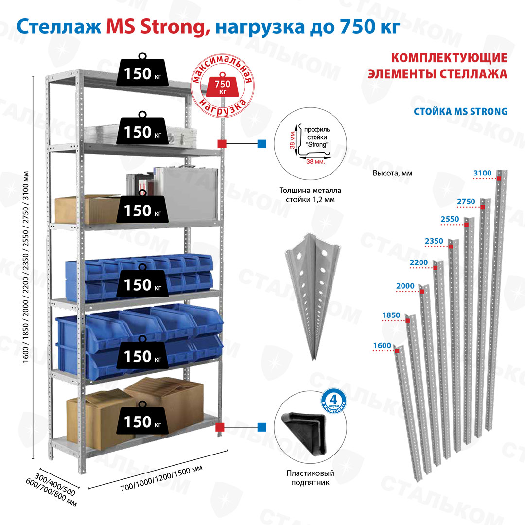 Купить стеллаж MS Strong 2750х1200х400, 6 полок в Чистополе с доставкой