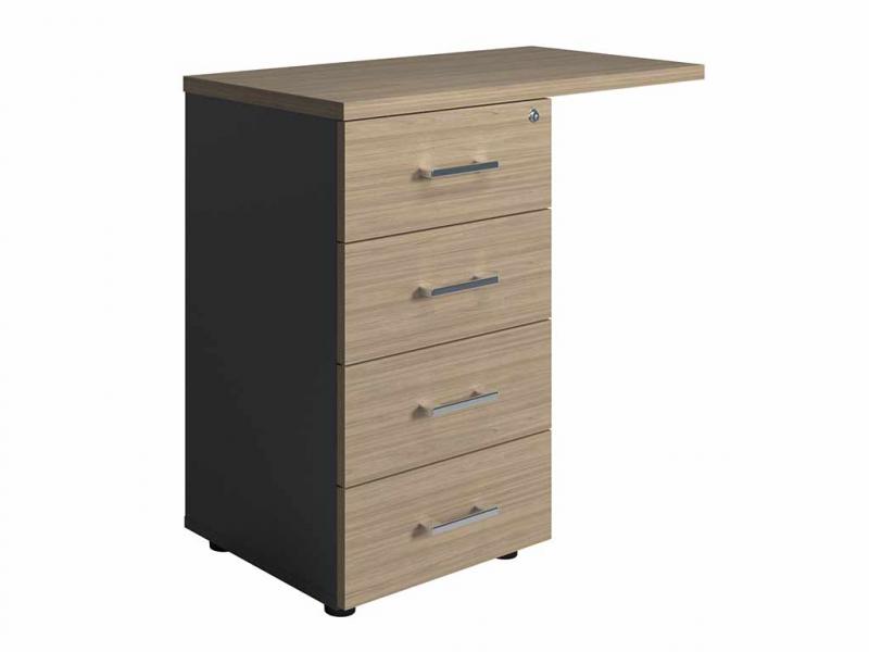 - тумба снабжена центральным замком и оснащена пластмассовым лотком для канцелярских принадлежностей в верхнем ящике